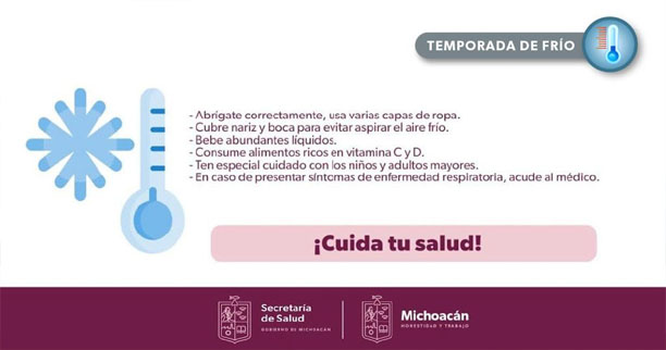 Morelia, Michoacán, 3 de enero de 2024.- La Secretaría de Salud de Michoacán (SSM) mantiene la vigilancia epidemiológica por la temporada invernal, sobre todo en las regiones donde se registran temperaturas más bajas, debido a que en esta época incrementan las infecciones respiratorias agudas y el riesgo de intoxicación por monóxido de carbono, hipotermia o quemaduras.