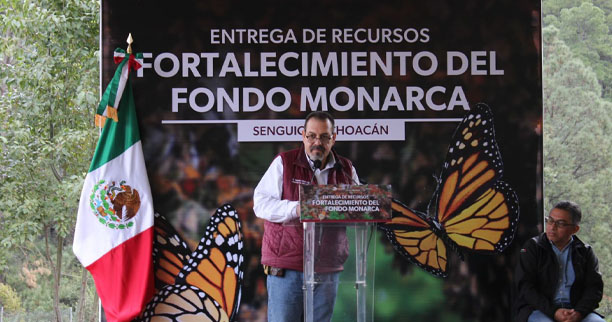 Morelia, Michoacán, 12 de enero de 2024.- Con la entrega de un millón de dólares para la conservación de la Reserva de la Biósfera de la Mariposa, el Gobierno de Michoacán no sólo cumple con un acuerdo del Fondo Monarca, sino que también contribuye con toda una red de esfuerzos de los tres países de América del Norte para conservar los hábitats de los que depende la supervivencia de esta especie a lo largo de su ruta migratoria, señaló el secretario del Medio Ambiente, Alejandro Méndez López.