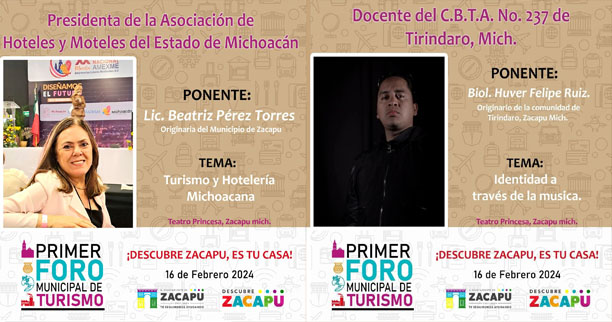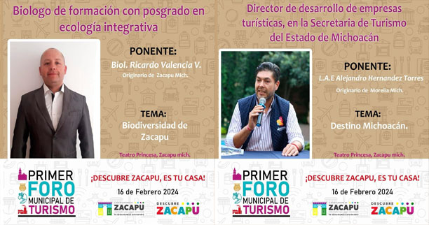 Zacapu Mich., 14 de febrero del 2024.– El Gobierno Municipal de Zacapu, encabezado por el Lic. Luis Felipe León Balbanera, en colaboración con la Dirección de Turismo y Cultura, bajo la dirección del TSU Carlos Aguilar, te invita cordialmente a asistir al Primer Foro de Turismo Municipal, el registro continúa abierto y es GRATIS, al culminar el evento, se entregará constancia de participación.