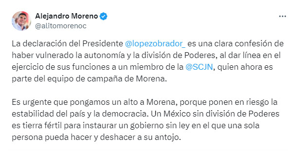 Alejandro Moreno, Presidente del Comité Ejecutivo Nacional (CEN) del Partido Revolucionario Institucional (PRI), calificó como una clara confesión de haber vulnerado la autonomía y la división de Poderes, por parte del Titular del Ejecutivo, Andrés Manuel López Obrador, al declarar que daba “línea” al Poder Judicial, con el anterior Presidente de la Suprema Corte de Justicia de la Nación (SCJN).