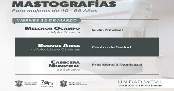 El viernes 22, las unidades móviles de mastografía estarán ubicadas en el centro de salud Buenos Aires de Lázaro Cárdenas, en el jardín principal de la localidad Melchor Ocampo del municipio de Tuzantla y en la presidencia municipal de Sahuayo. Todas estarán abiertas en un horario de 9 a 18 horas.