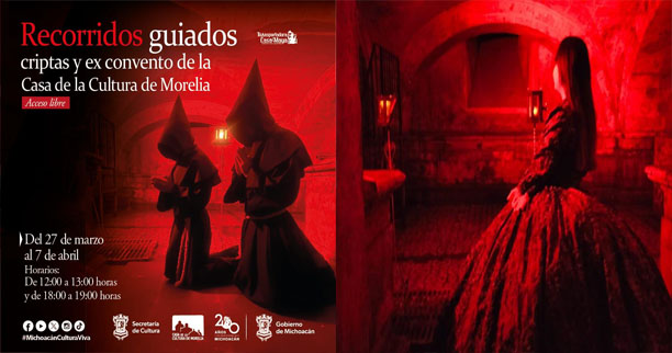 Morelia, Michoacán, 27 de marzo de 2024.- ¿Quieres disfrutar de una experiencia llena de misterio e historias de la época virreinal? Esta Semana Santa la Secretaría de Cultura de Michoacán (Secum) te invita a los recorridos gratuitos por las criptas del Antiguo Convento de los Carmelitas Descalzos, ahora Casa de la Cultura de Morelia.