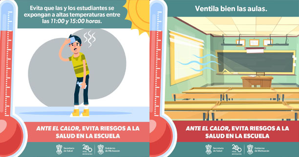 Morelia, Michoacán, 11 de abril de 2024.- La Secretaría de Salud de Michoacán (SSM) llama a docentes y personal educativo a no exponer a las y los estudiantes a las altas temperaturas y asegurarse de que se mantengan hidratados con agua simple para prevenir la deshidratación y los golpes de calor en las escuelas.