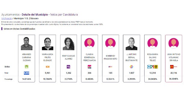 Con un total de 20 mil 116 votos a su favor, Toño Ixtláhuac obtuvo el 36.3340% de los sufragios, posicionándose claramente por delante de su principal oponente, Rosa María Salinas Téllez, quien alcanzó 13 mil 310 votos. En tercer lugar, Armando Carmona del Partido Verde logró una cantidad significativa de votos, aunque no suficiente para figurar como un contendiente cercano.