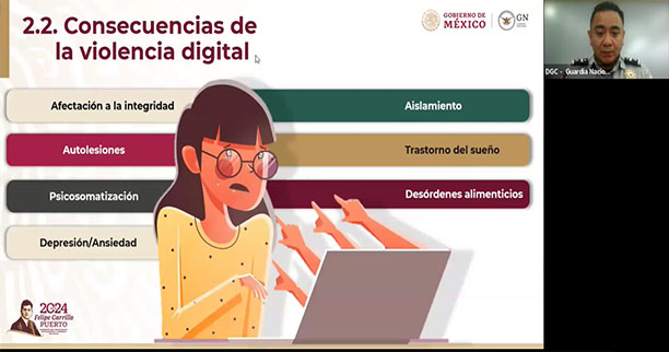 Los oficiales José de Jesús Gaitán Trejo y Eduardo Alcaraz Hernández de la Dirección General Científica perteneciente a la Guardia Nacional, abordaron durante dos días el panorama digital que existe en México respecto a situaciones que pueden atentar contra la integridad y seguridad de las personas al hacer uso de las plataformas tecnológicas y dispositivos móviles.