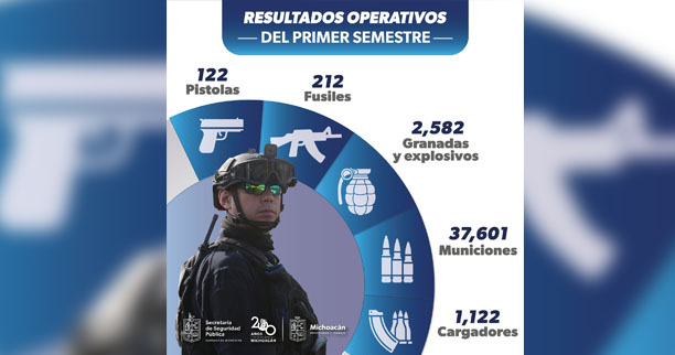 Entre lo asegurado se encuentra arsenal de alto calibre, que inclusive puede dañar sistemas de blindaje. Su aseguramiento contribuye en la reducción de la incidencia delictiva en Michoacán.