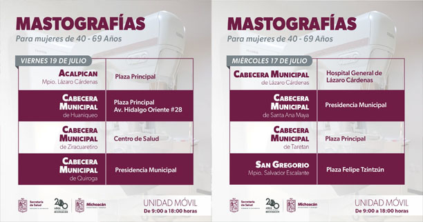 El 16 de julio las mastografías gratuitas se efectuarán en la presidencia municipal de Santa Ana Maya; y en las mismas sedes de La Mira y Madero, y en el centro de salud de Tingambato.
