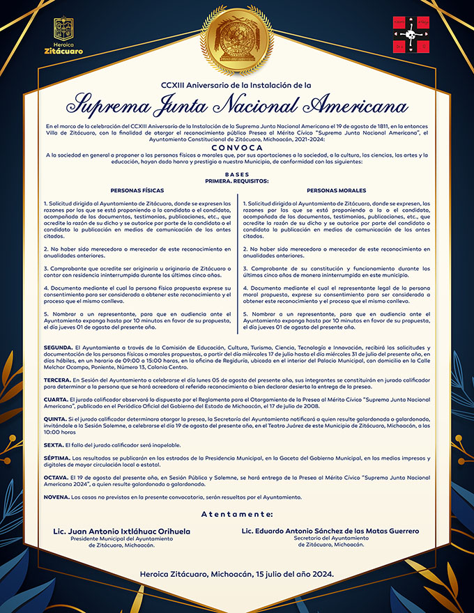 Zitácuaro, Mich., 17 de julio del 2024.- El Ayuntamiento de Zitácuaro presidido por Juan Antonio Ixtláhuac, lanzó la convocatoria dirigida a personas físicas o morales que puedan ser recipiendarios de la Presea al Mérito Cívico “Suprema Junta Nacional Americana”, en el marco del CCXIII aniversario de la instalación del primer gobierno independiente en esta ciudad que se celebrará el próximo 19 de agosto.