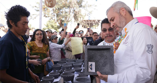 El mandatario reconoció a las y los artesanos que por décadas se han dedicado al trabajo de la piedra volcánica para transformarla en obras de gran belleza y originalidad e invitó a las y los asistentes a adquirir alguna de las piezas que se encuentran a disposición y con ello, fomentar y consolidar el molcajete de San Nicolás Obispo