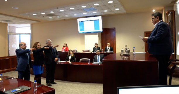 Morelia, Michoacán, 18 de diciembre de 2024. El magistrado presidente Jorge Reséndiz García, el magistrado Marco Antonio Flores Negrete y la jueza en retiro Margarita Leal Torrez rindieron protesta ante el presidente sustituto Gerardo Contreras Villalobos y el pleno del Supremo Tribunal de Justicia del Estado (STJE) como integrantes del Comité Evaluador de Aspirantes a ocupar algún cargo de juez o magistrado del Poder Judicial para la elección extraordinaria del 1 de junio de 2025.