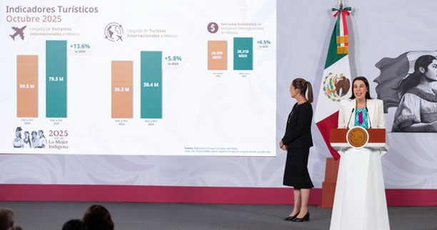 Puntualizó que el récord histórico que se registró en octubre de 2025 y el incremento de 13.6 por ciento de enero a octubre de este año representan indicadores muy importantes para el turismo nacional, los cuales se deben al gran trabajo que se realiza desde la Secretaría de Turismo que ha desarrollado diferentes Tianguis Turísticos a nivel mundial, además de que se busca generar promoción a través de incentivos para la producción de películas y series.