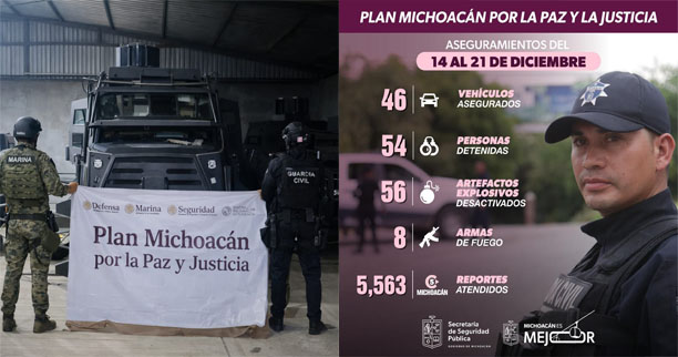 Morelia, Michoacán, 23 de diciembre de 2025.- La Secretaría de Seguridad Pública (SSP) realizó la detención de 54 personas, el aseguramiento de ocho armas de fuego, la desactivación de 56 artefactos explosivos y la recuperación de 46 vehículos, durante el periodo del 14 al 21 de diciembre. Las acciones operativas dentro del Plan Paricutín permitieron también la atención a 5 mil 563 reportes de emergencia.