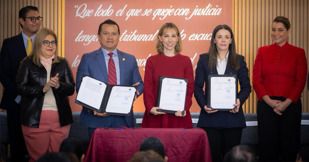 El convenio fue signado por el Fiscal General del Estado, Carlos Torres Piña; la Magistrada Presidenta del TAAM, Lizette Puebla Solórzano; y la Contralora Interna de la FGE, Alondra Godínez Navarrete.
