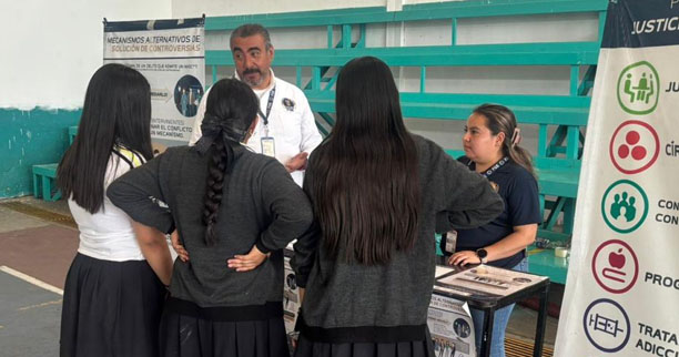 El titular del CMASC, Alejandro Villaverde, en compañía de personal adscrito a la Dirección de Programas de Justicia Restaurativa, acudió al centro educativo para promover los Mecanismos Alternativos de Solución de Controversias (MASC) y los Programas de Justicia Restaurativa, como herramientas eficaces para la atención y resolución de conflictos mediante el diálogo, la mediación y la conciliación.