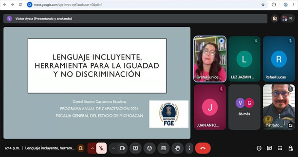 Morelia, Michoacán, a 14 de marzo de 2026.- La Fiscalía General del Estado de Michoacán, a través del Instituto de Capacitación y Servicio Profesional de Carrera (INCASEP), llevó a cabo la capacitación denominada “Lenguaje incluyente, herramienta para la igualdad de género”, como parte de su programa semanal de profesionalización.