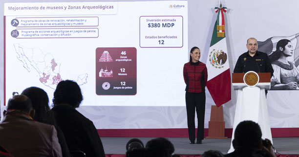El director general del INAH, Joel Omar Vázquez Herrera, detalló que con la inversión de 380 mdp se implementan los Programas de acciones de Renovación, Rehabilitación y Mejoramiento de Zonas Arqueológicas y Museos, así como de acciones arqueológicas en Juegos de Pelota, Museográfica, Conservación y Difusión, y se tiene un avance de 46 por ciento con 12 estados beneficiados, 46 zonas arqueológicas, 12 museos y 12 juegos de pelota, con el objetivo de mejorar la experiencia de las y los visitantes.